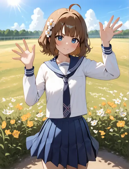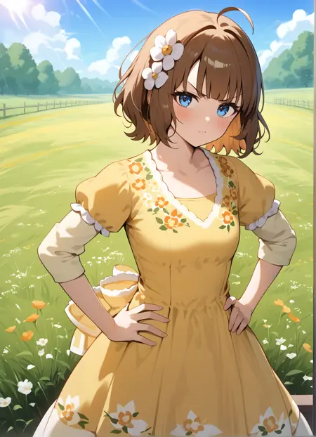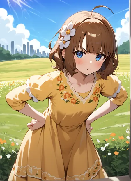 blush, short hair, bangs, blue eyes, brown hair, hair ornament, ahoge, hair flower, v-shaped eyebrows, suou momoko