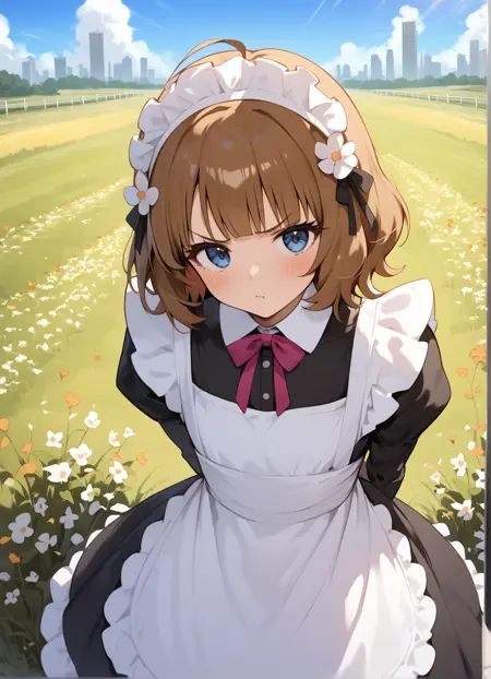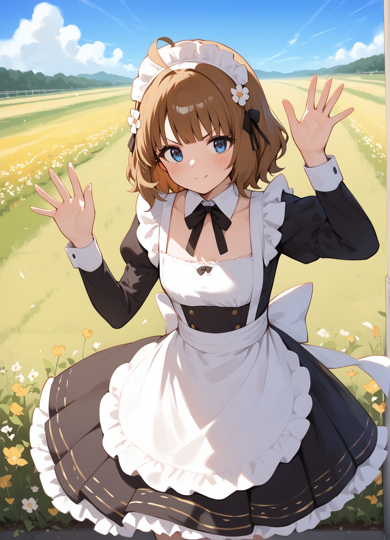 _ blush, 단발, 앞머리, 파란 눈, 갈색 머리, 머리 장식, ahoge, 머리 꽃, V자형 눈썹, suou momoko