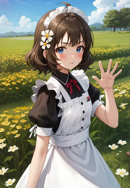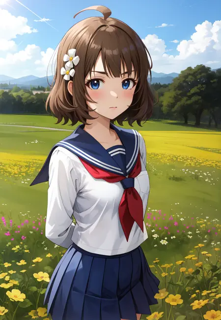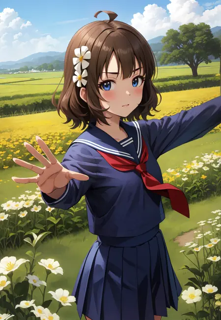 blush, short hair, bangs, blue eyes, brown hair, hair ornament, ahoge, hair flower, v-shaped eyebrows, suou momoko