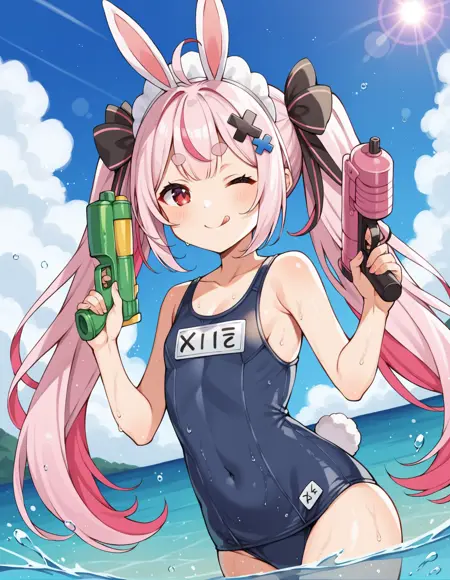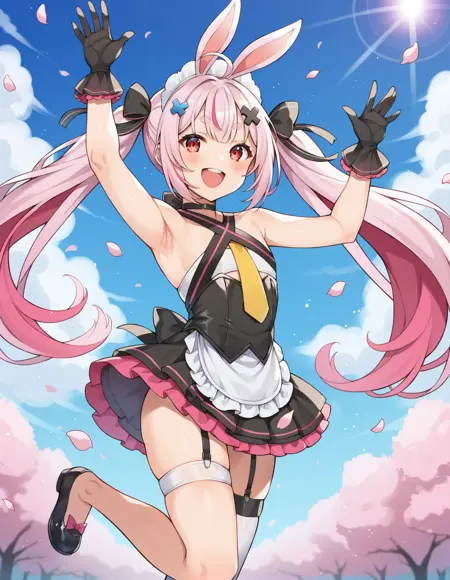 トリガー語:tomari mari, 1girl, virtual youtuber, 兎の耳, 長髪, ツインテール, 非常に長い髪, ピンク髪, 二色髪, 多色髪, ストライプ髪, ahoge, 厚い眉毛, 短い眉毛, 赤い目, 兎の尾