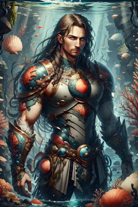 珊瑚、贝壳、海带、金色、水下、切割石材、光滑,