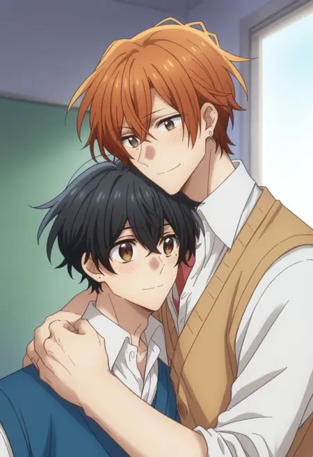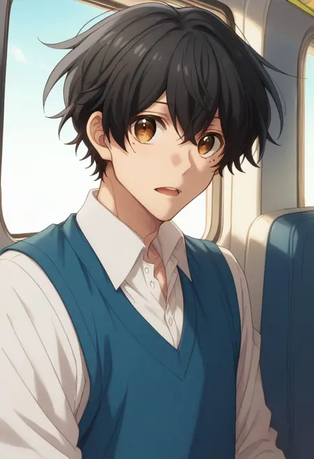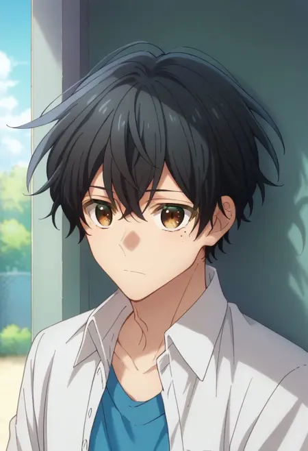 宫野,1个男孩,男性主角,黑发,眼下有痣,痣,棕眼,衬衫,白衬衫,头发遮住眼睛,背心