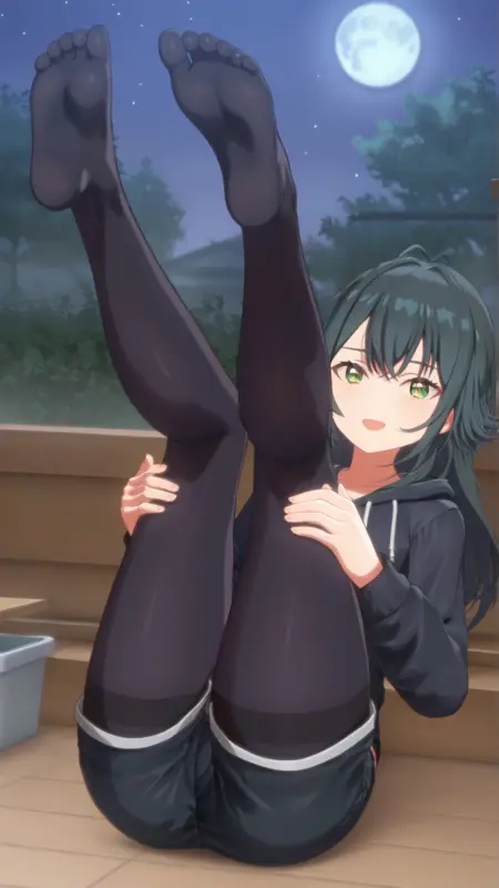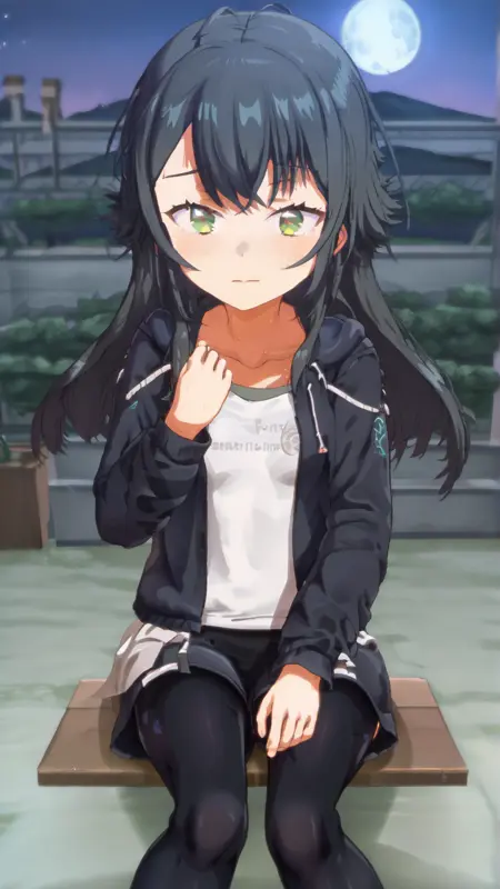 tsukimura_temari_sportswear, tsukimura_temari, 1girl, black hair, jacket, leggings, long hair, pants, shirt, shoes, solo