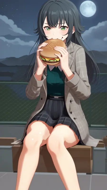 tsukimura_temari_r_outfit, tsukimura_temari, 1girl, black hair, plaid coat, long hair, silk, skirt, solo,