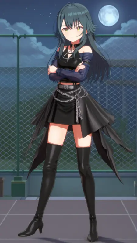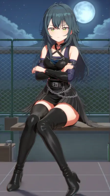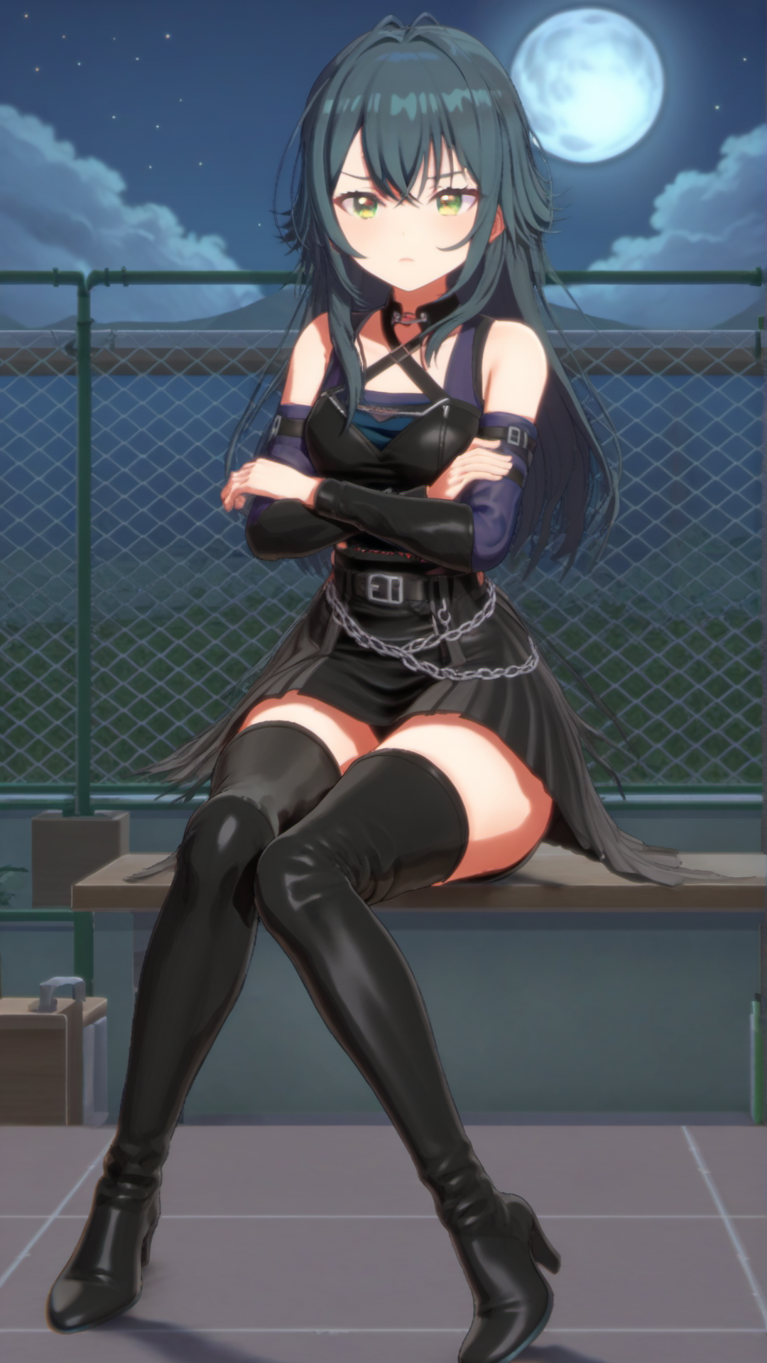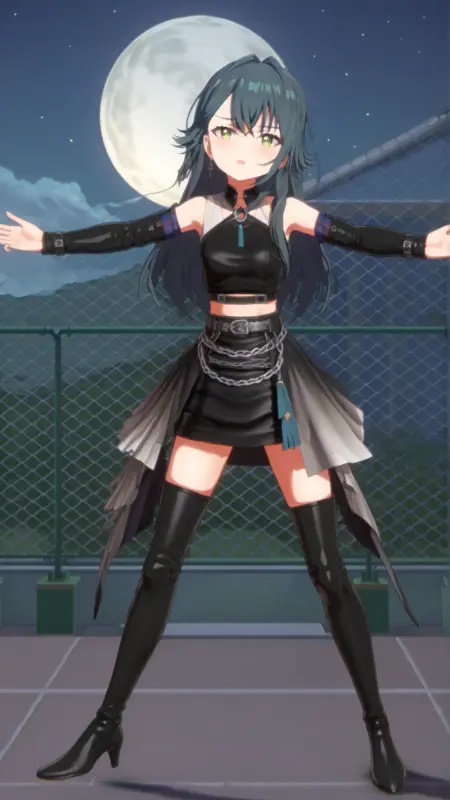 tsukimura_temari, tsukimura_temari_ssr_luna_outfit, 1girl, black hair, boots, high heel boots, high heels, long hair, silk, solo,