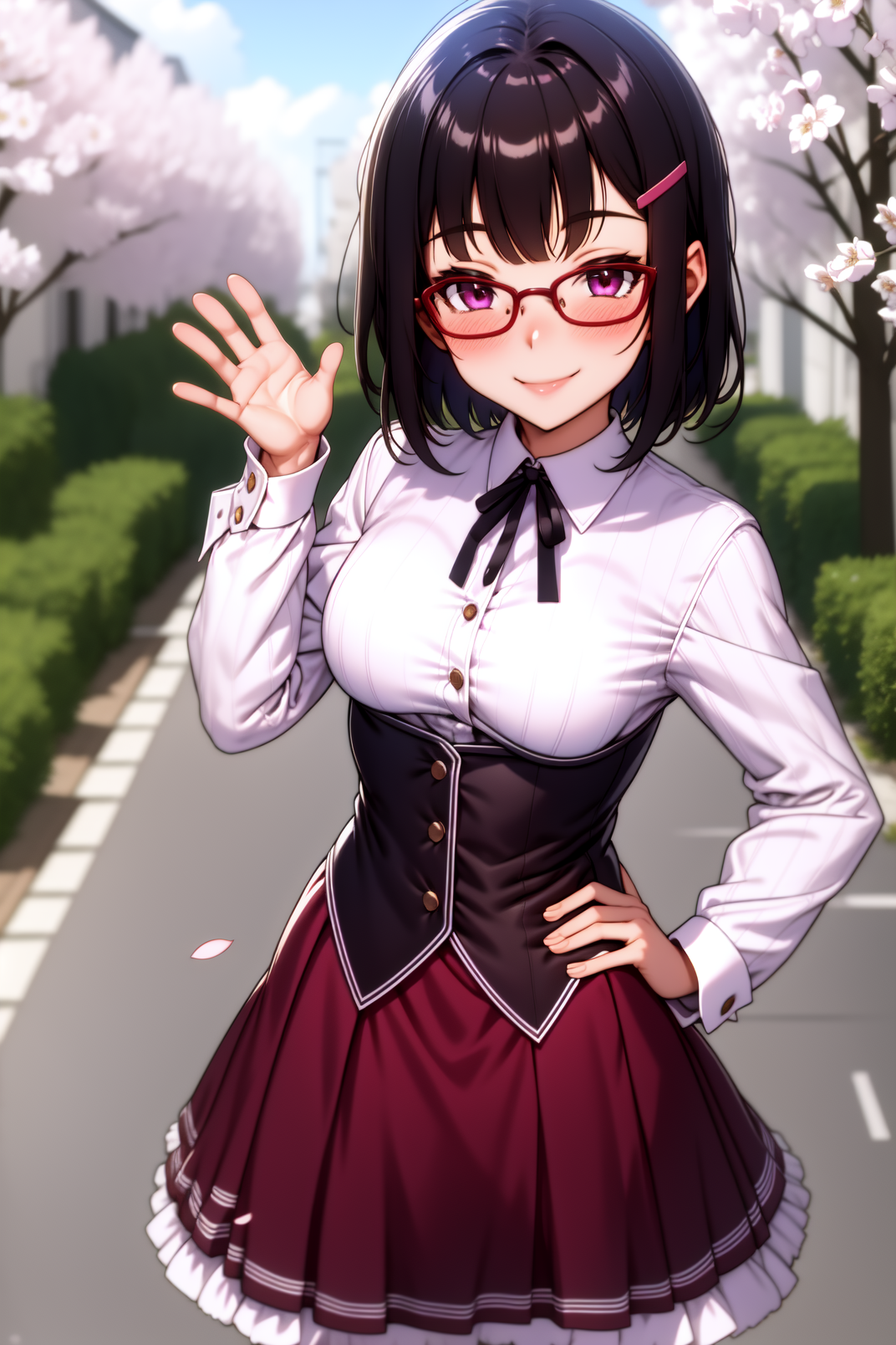 服装:有领衬衫,长袖,黑色丝带,颈饰丝带,竖条纹衬衫,黑色束腰,黑色短斗篷,深红色百褶裙