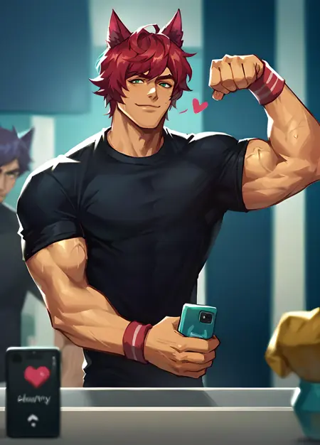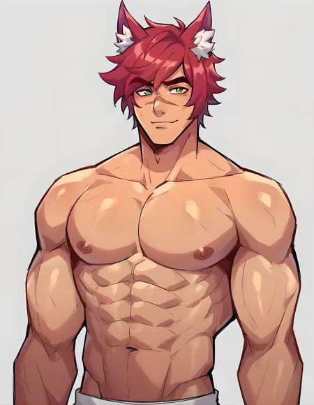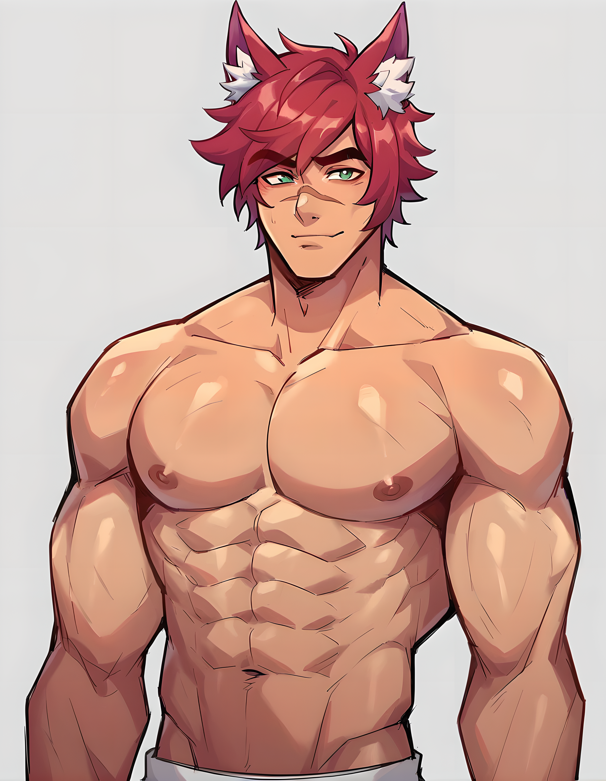 hs sett, solo, looking at viewer, green eyes, short hair, 1boy, animal ears, male focus, red hair, animal ear fluff, muscular, abs, thick eyebrows, pectorals, muscular male, large pectorals, scar on nose,