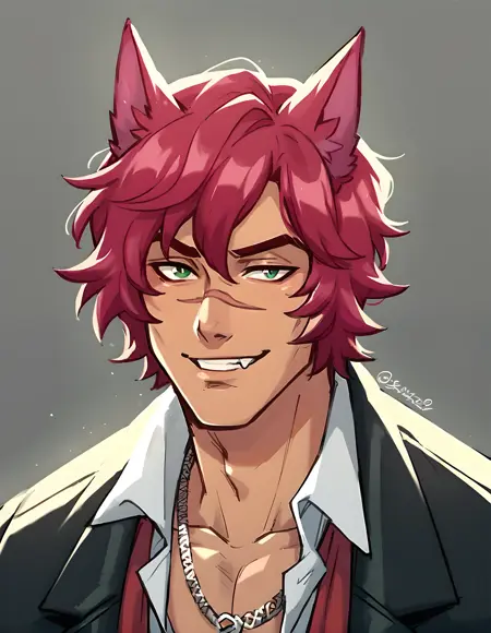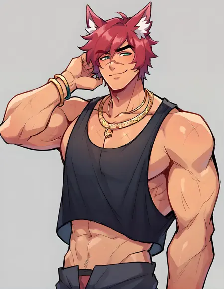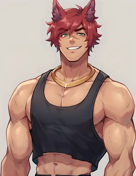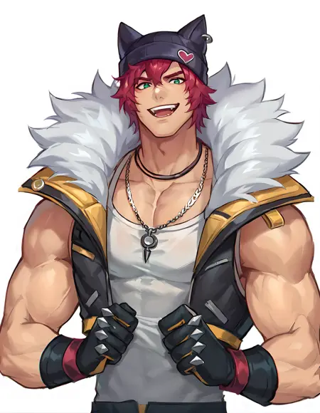hs sett, solo, green eyes, gloves, 1boy, jewelry, jacket, upper body, male focus, red hair, sleeveless, black gloves, necklace, fur trim, muscular, pectorals, muscular male, bara, animal ears, black headwear,animal hat, white tank top,