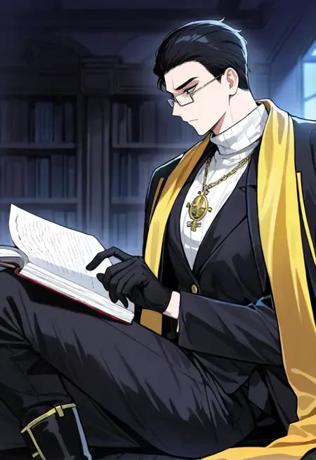 MeursaultDieci, 흰 터틀넥, 검은 로브, 검은 코트, 벌어진 코트, 검은 장갑, 검은 바지, 검은 부츠, 노란 스톨, 사각 안경, 금색 목걸이
