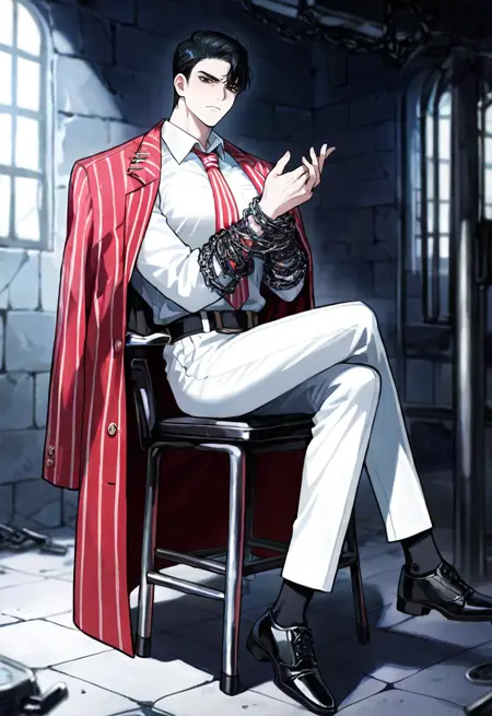 MeursaultEGO, 흰 셔츠, 흰 바지, 흰색과 빨간색 줄무늬 넥타이, 흰색과 빨간색 줄무늬 코트, 어깨에 걸친 코트, 검은 신발, 체인, 팔에 묶인 체인