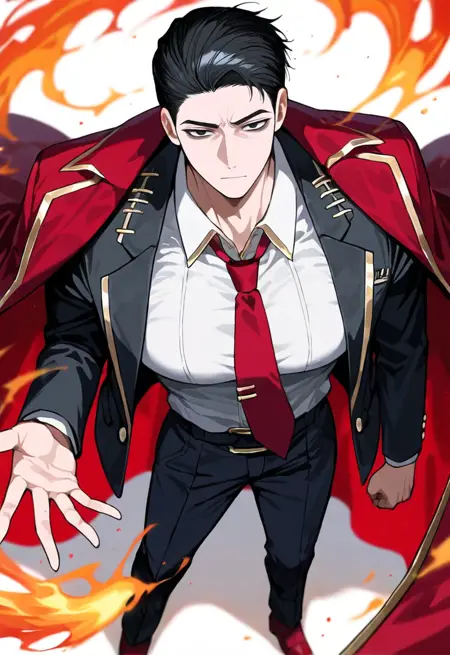 MeursaultLiu, 갈색 신발, 검은 바지, 흰 셔츠, 빨간 넥타이, 검은 조끼, 빨간 망토, 빨간 어깨 패드, 불