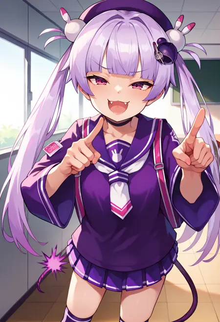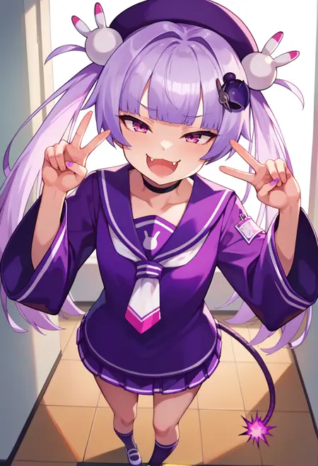- hat, choker, purple school uniform, purple shirt, long shirt, wide sleeves, skirt, tail, purple socks, uwabaki, backpack,