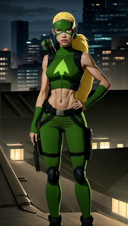 basic outfit: green mask, green costume, sleeveless, midriff, arrow logo, green pants, knee pads