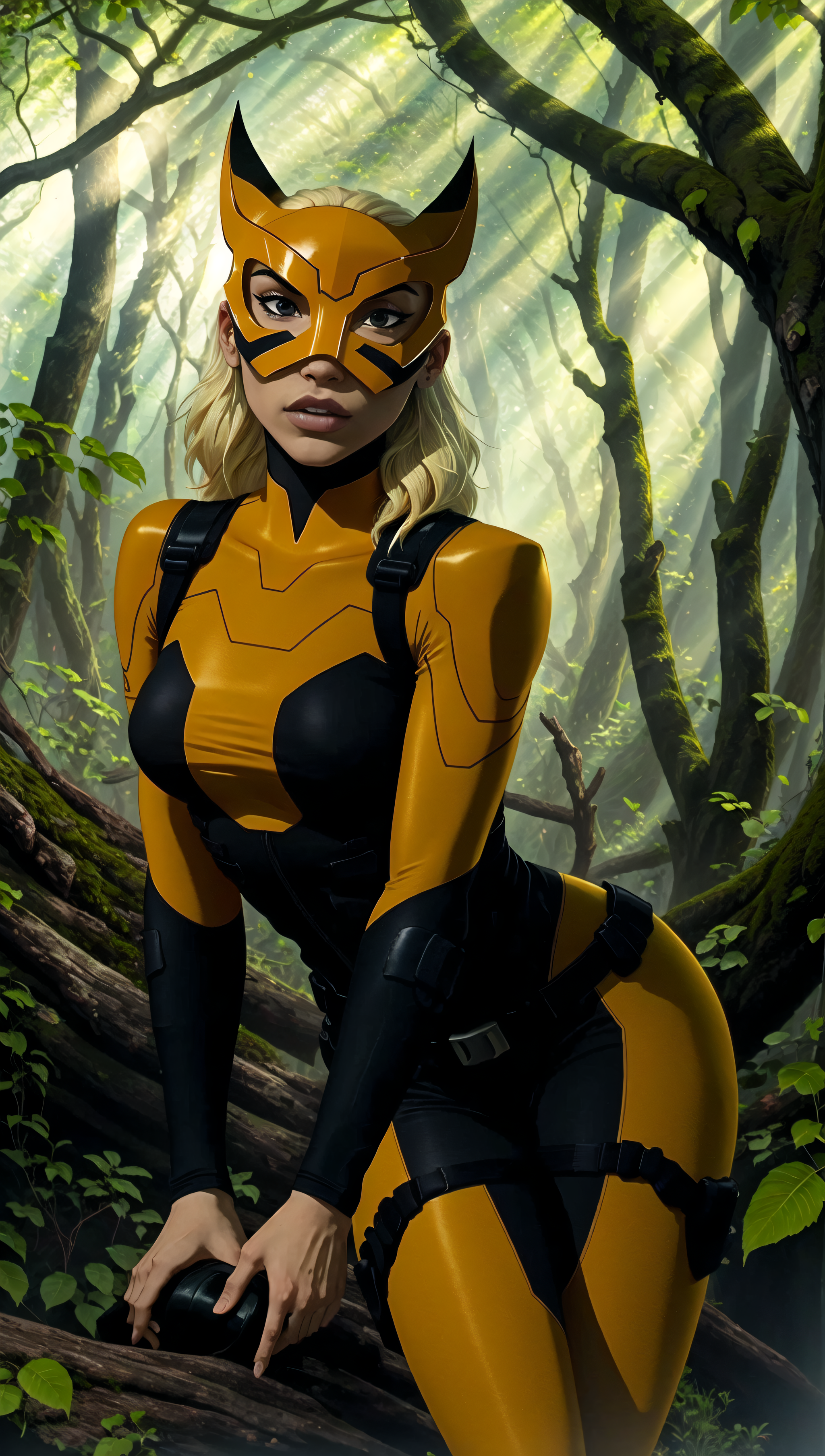 tigress outfit: stylized tiger mask, orange and black bodysuit, hip pouch, choker