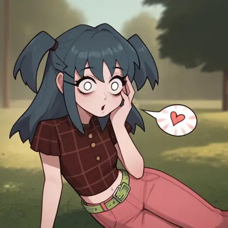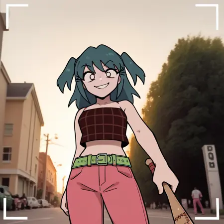two side up, pink pants, green belt, burgundy checkered crop top, bare shoulders