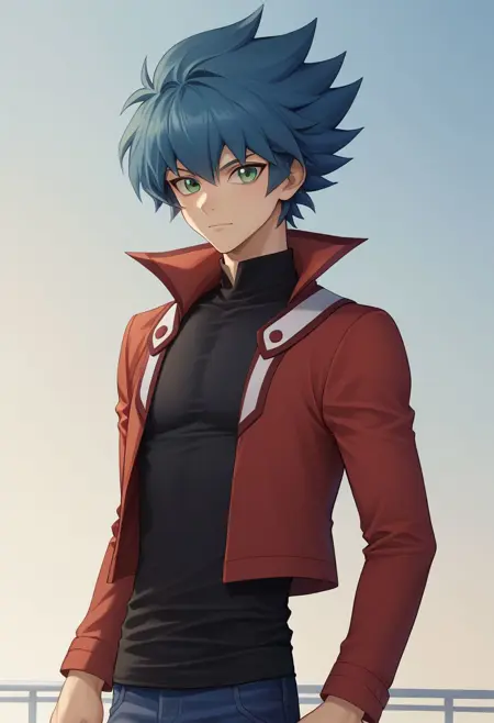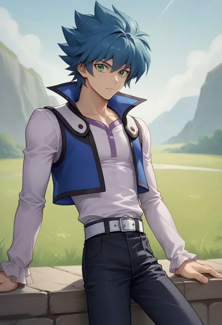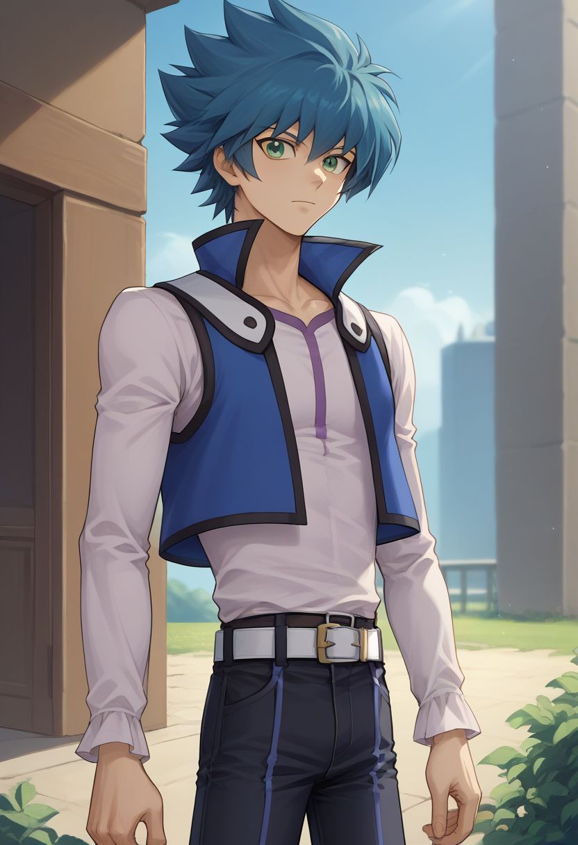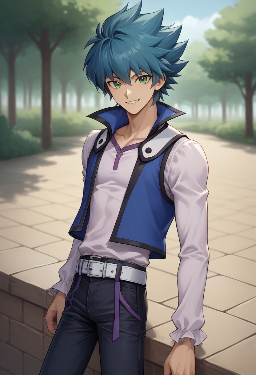 jesse, 1boy, male focus, green eyes, belt, duel academy uniform (yu-gi-oh! gx), blue hair, pants, vest, spiked hair, long sleeves,