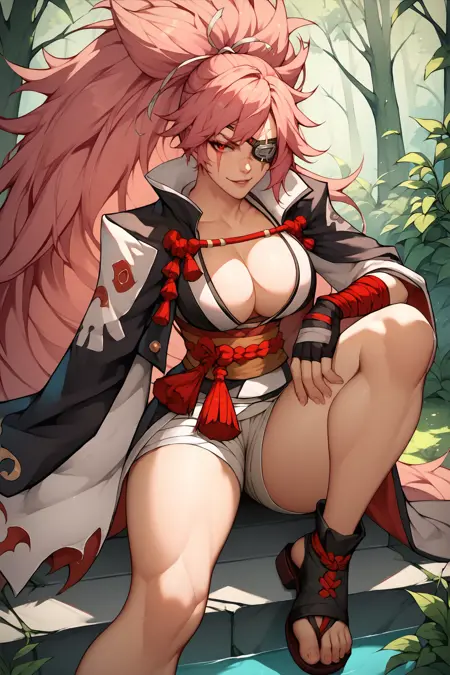 ➜ BaikenGGXL, 眼部疤痕, 穿越眼睛的疤痕, 眼罩, 红眼, 粉色头发, 长马尾, 大胸, (右臂截肢), 乳沟, 和服, 多色和服, 棕色腰带, 红色绳索, 绳索腰带, 绷带, 黑色鞋子, 无鞋趾鞋, 拖鞋