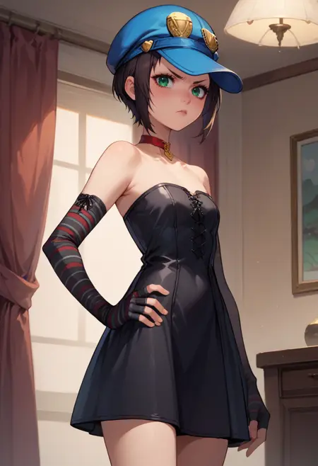 Default Outfit: blue headwear, cabbie hat, striped clothes, white shirt, sleeveless shirt, black necktie, striped gloves, elbow gloves, fingerless gloves, red skirt, plaid skirt, belt, striped thighhighs, red choker, shoulder bag, bare shoulders