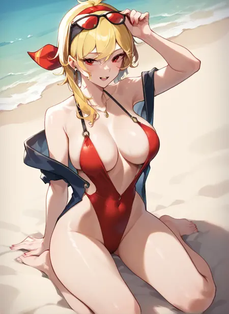 Trigger: KaelaPony, red eyes, eyewear on head, blonde hair, gloves, white dress, large breasts,