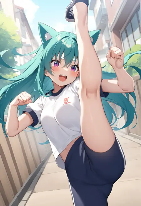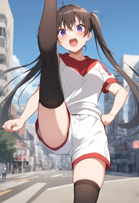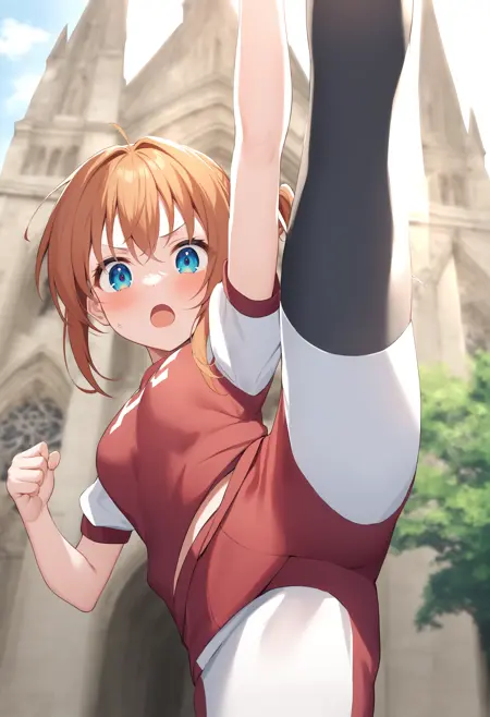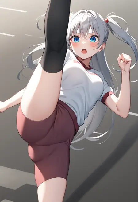無くても出ますが kicking, standing on one leg, leg up, high kick, standing split 辺りもおまじない代わりに。I字バランスと違って手で足は持たないのでチアリーディングのポーズにもいいかもしれません。状況的にネガティブに指定しないとほぼ100%パンチラが発生します。