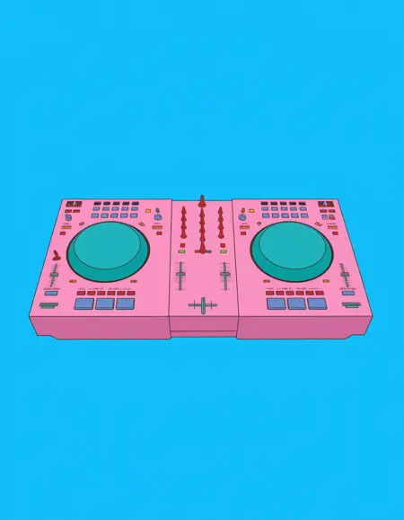 a flat color illustration of a purple gaming controller with green, yellow, blue, and red buttons against a light blue background in the style of michael-craig-martin