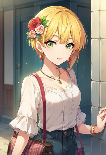 Trigger Words: miyamoto furederika, short hair, blonde hair, green eyes