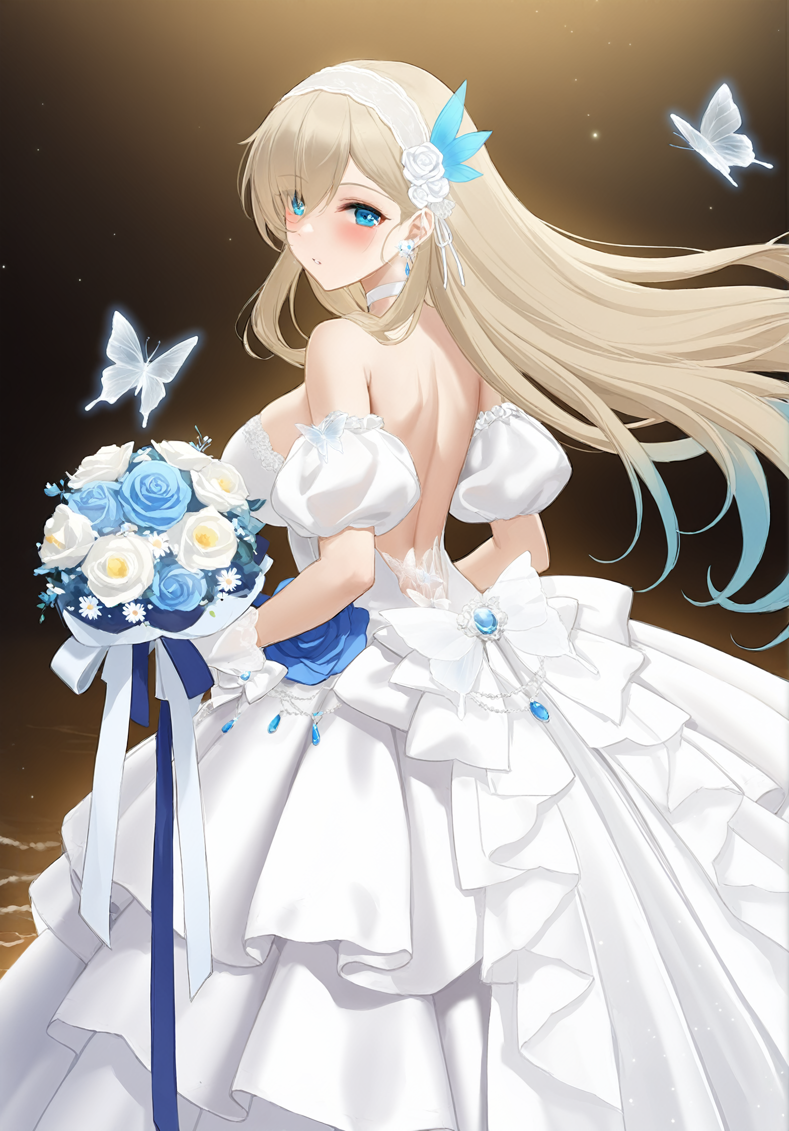 オプショントリガー:vase, photo (object), 1girl, long hair, blonde hair, blue eyes, picture frame, looking at viewer, dress flower, bare shoulders, lace trim, layered dress, large breasts, white gloves, bride, looking back, strapless dress, white dress, blue feather hair ornament, wedding dress, solo, holding bouquet, long dress, gown, backless dress, blue flower, white rose, full body, ta-4j, model airplane, back bow, blue ribbon, earrings, blush, ocean, lace bow, dress bow, satin dress, veil, standing, puffy detached sleeves, puffy short sleeves, official alternate costume, frilled dress, display, glass, glass vase, feather hair ornament, blue feathers, lace hairband, white hairband, daisy, hair flower, white hair flower, falling petals, lace gloves, blue gemstone, white bow, white choker, floating hair, lace applique, white applique, transparent butterfly, white butterfly, white ribbon, character:lexington (cv-16) (戦艦少女R), tachi-e