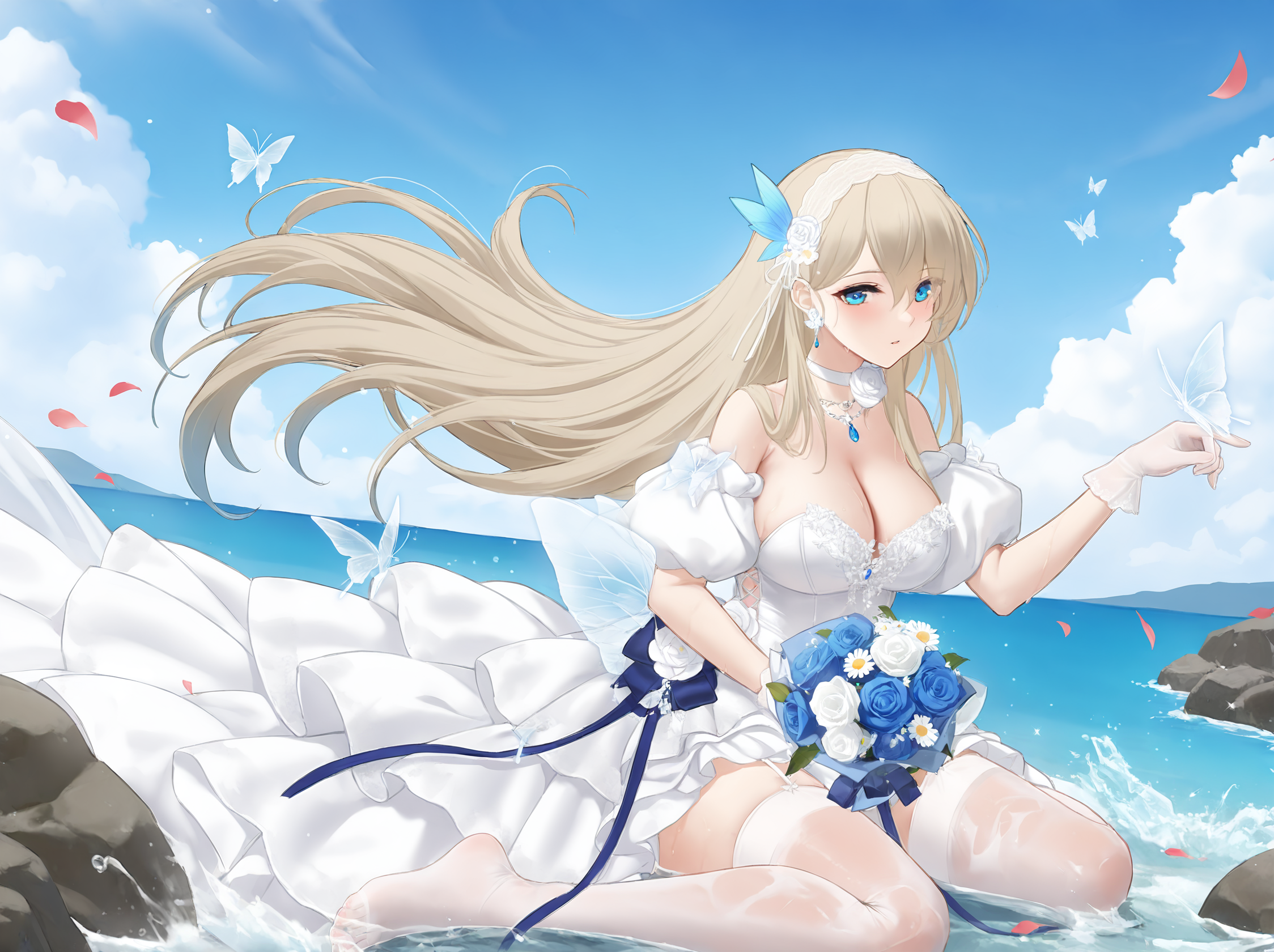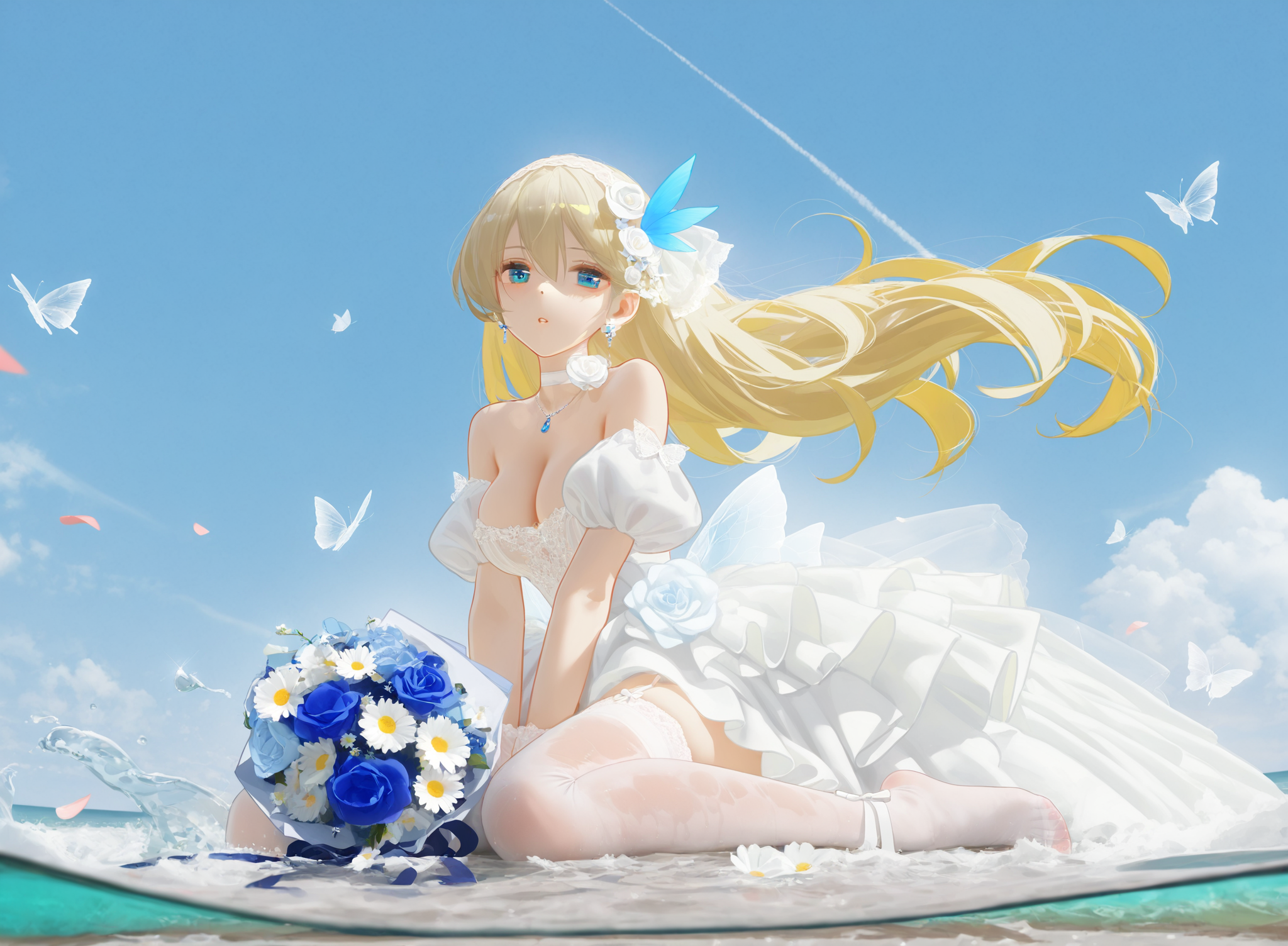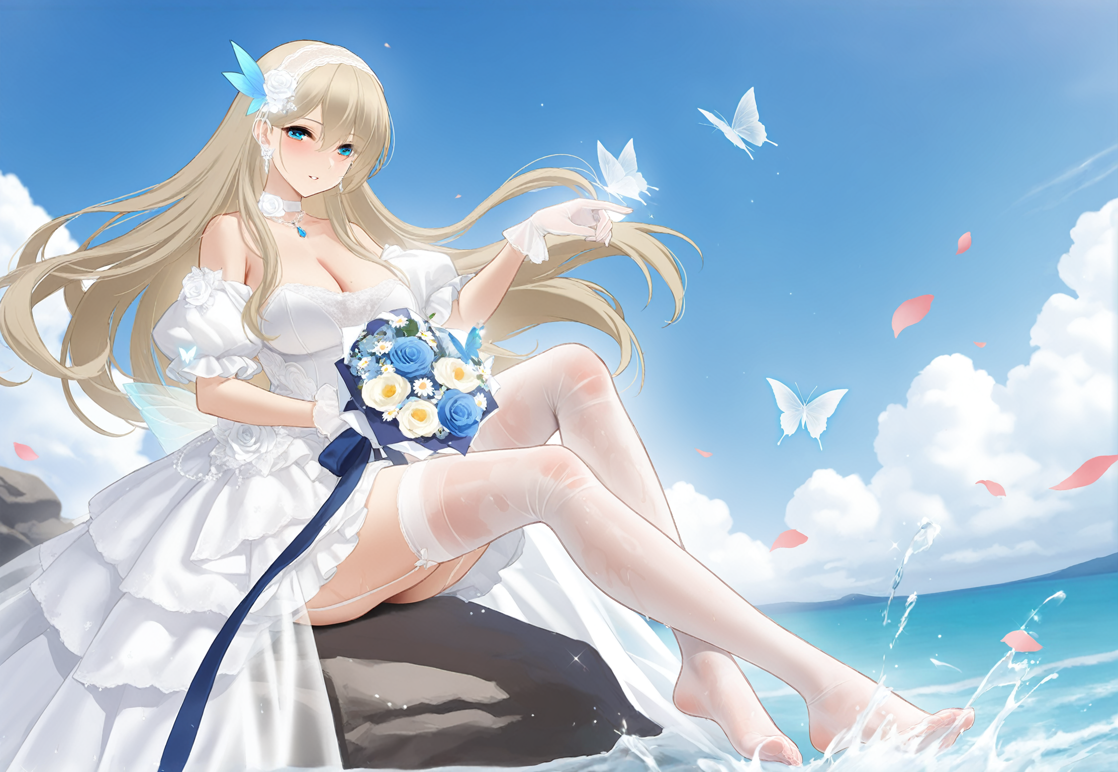 オプショントリガー:white ribbon, 1girl, rock, blonde hair, cleavage, water, solo, holding bouquet, full body, looking at viewer, bare shoulders, feet, legs, blue sky, cloud, outdoors, wind, waves, floating hair, toes, splashing, wedding dress, white dress, strapless dress, large breasts, blue eyes, day, puffy short sleeves, puffy detached sleeves, official alternate costume, blue feather hair ornament, feather hair ornament, blue feathers, white choker, white gloves, butterfly on hand, falling petals, white elastic band, white garter straps, sitting, sitting on rock, necklace, earrings, blue gemstone, wet clothes, see-through, white thighhighs, frilled dress, white rose, blue rose, toenails, very long hair, ocean, see-through thighhighs, wet thighhighs, no shoes, lace trim, lace dress, layered dress, lace bow, back bow, lace hairband, white bow, transparent butterfly, white butterfly, butterfly on bouquet, hair flower, white hair flower, daisy, satin dress, lace gloves, blue ribbon, character:lexington (cv-16) (戦艦少女R), tachi-e