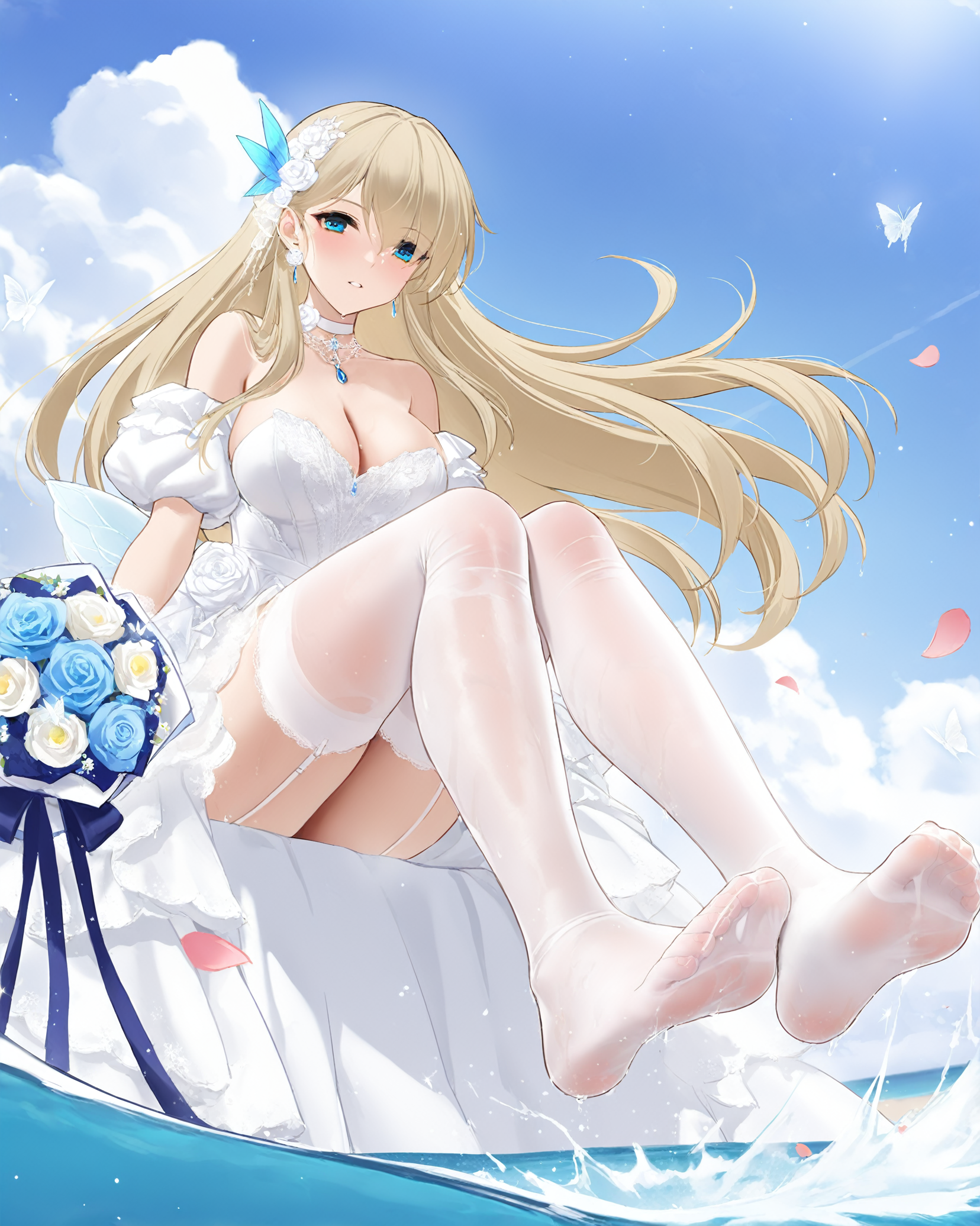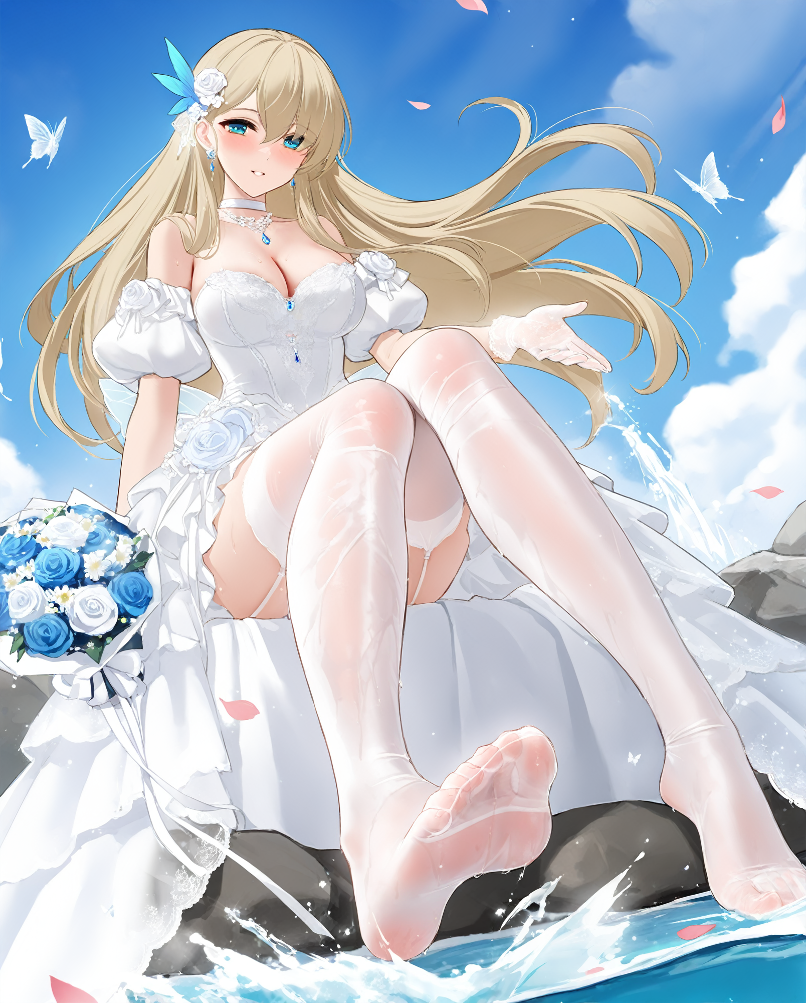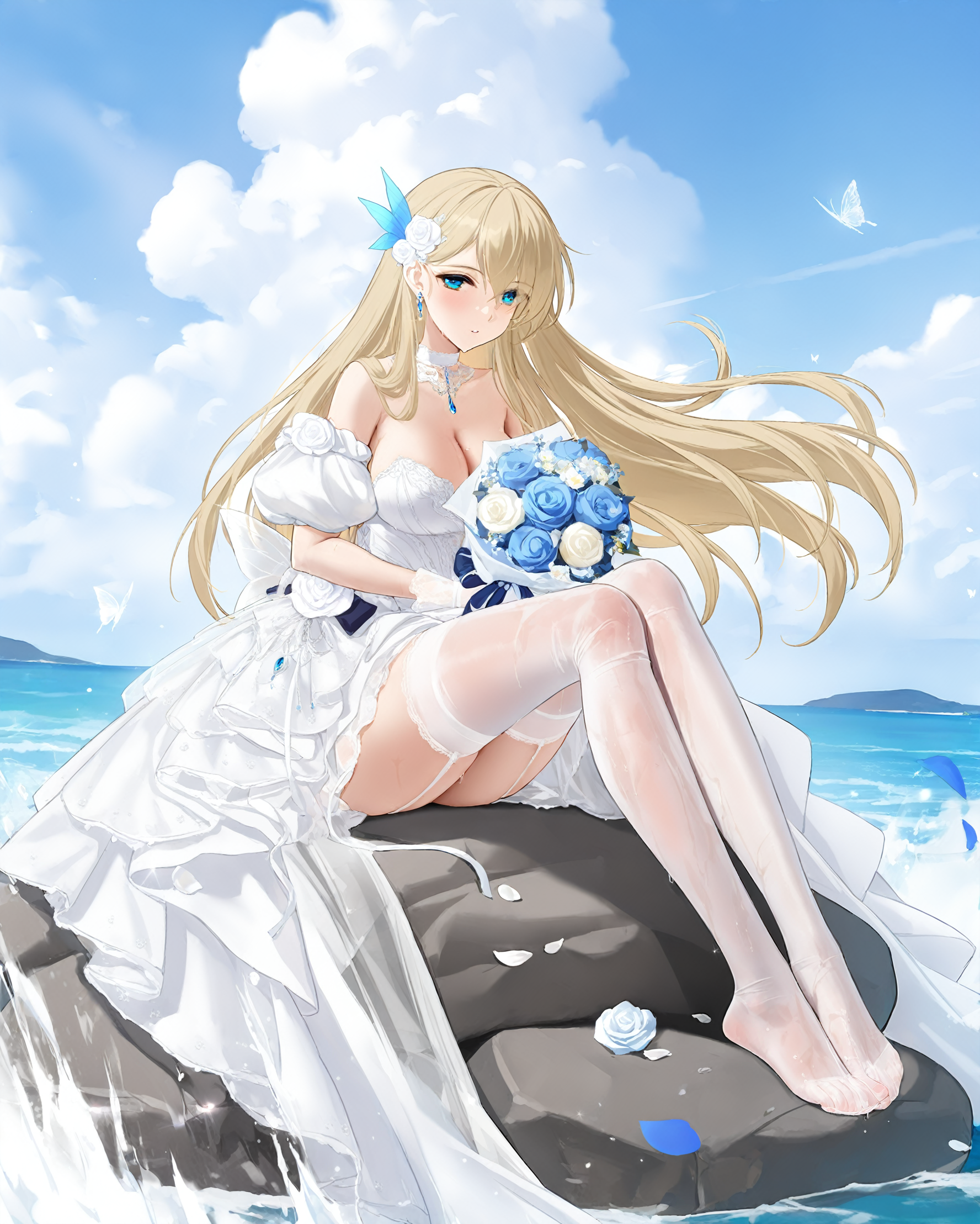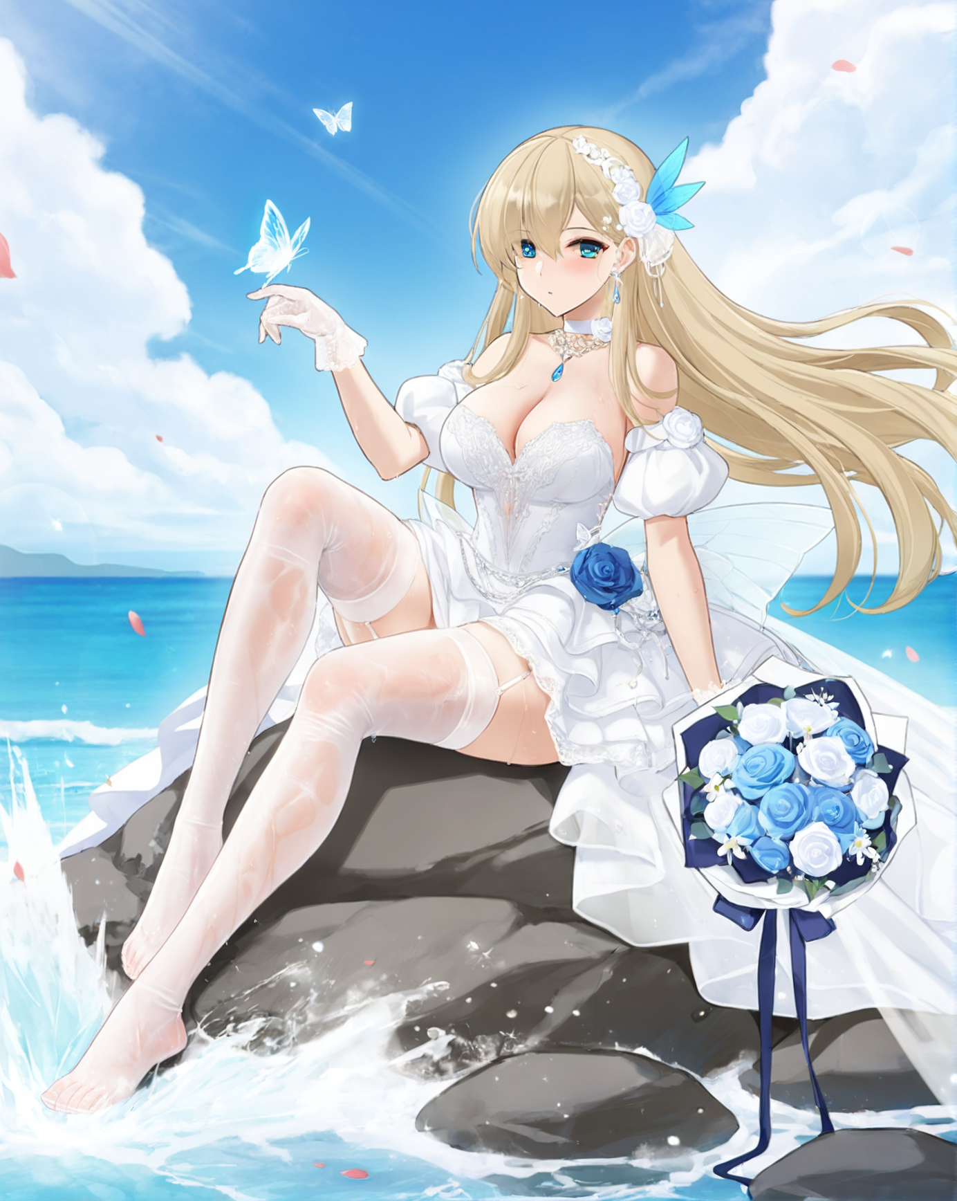 オプショントリガー:white ribbon, 1girl, rock, blonde hair, cleavage, water, solo, holding bouquet, full body, looking at viewer, bare shoulders, feet, legs, blue sky, cloud, outdoors, wind, waves, floating hair, toes, splashing, wedding dress, white dress, strapless dress, large breasts, blue eyes, day, puffy short sleeves, puffy detached sleeves, official alternate costume, blue feather hair ornament, feather hair ornament, blue feathers, white choker, white gloves, butterfly on hand, falling petals, white elastic band, white garter straps, sitting, sitting on rock, necklace, earrings, blue gemstone, wet clothes, see-through, white thighhighs, frilled dress, white rose, blue rose, toenails, very long hair, ocean, see-through thighhighs, wet thighhighs, no shoes, lace trim, lace dress, layered dress, lace bow, back bow, lace hairband, white bow, transparent butterfly, white butterfly, butterfly on bouquet, hair flower, white hair flower, daisy, satin dress, lace gloves, blue ribbon, character:lexington (cv-16) (戦艦少女R), tachi-e