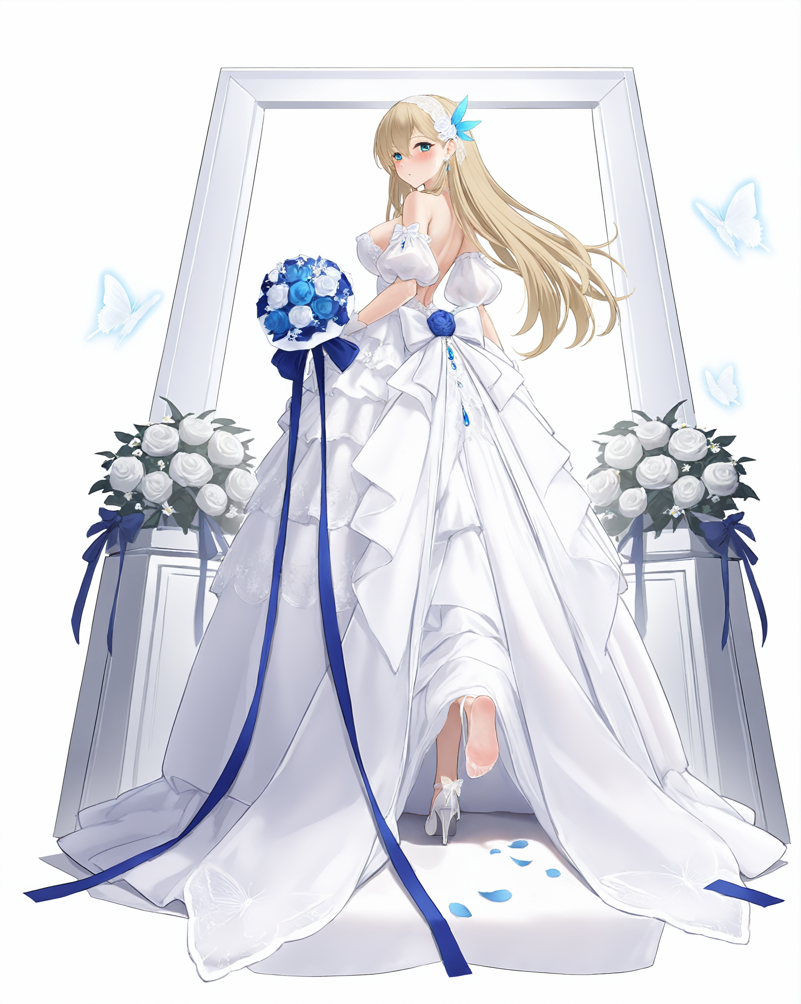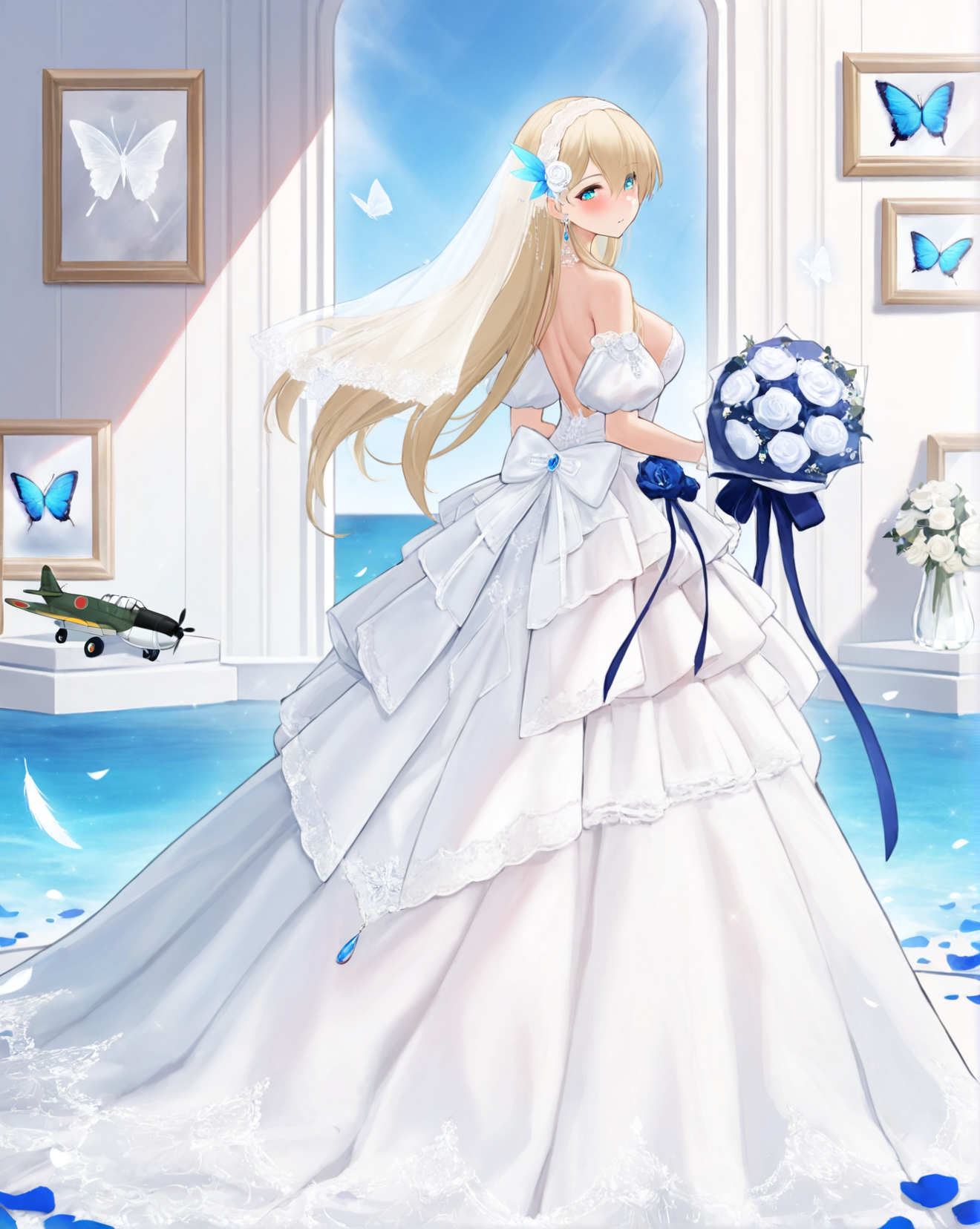 オプショントリガー:vase, photo (object), 1girl, long hair, blonde hair, blue eyes, picture frame, looking at viewer, dress flower, bare shoulders, lace trim, layered dress, large breasts, white gloves, bride, looking back, strapless dress, white dress, blue feather hair ornament, wedding dress, solo, holding bouquet, long dress, gown, backless dress, blue flower, white rose, full body, ta-4j, model airplane, back bow, blue ribbon, earrings, blush, ocean, lace bow, dress bow, satin dress, veil, standing, puffy detached sleeves, puffy short sleeves, official alternate costume, frilled dress, display, glass, glass vase, feather hair ornament, blue feathers, lace hairband, white hairband, daisy, hair flower, white hair flower, falling petals, lace gloves, blue gemstone, white bow, white choker, floating hair, lace applique, white applique, transparent butterfly, white butterfly, white ribbon, character:lexington (cv-16) (戦艦少女R), tachi-e