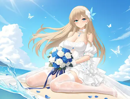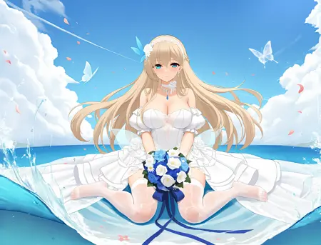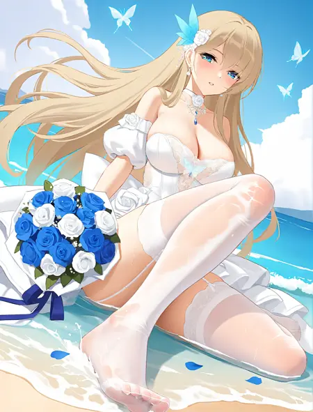 非强制性触发词white ribbon, 1girl, rock, blonde hair, cleavage, water, solo, holding bouquet, full body, looking at viewer, bare shoulders, feet, legs, blue sky, cloud, outdoors, wind, waves, floating hair, toes, splashing, wedding dress, white dress, strapless dress, large breasts, blue eyes, day, puffy short sleeves, puffy detached sleeves, official alternate costume, blue feather hair ornament, feather hair ornament, blue feathers, white choker, white gloves, butterfly on hand, falling petals, white elastic band, white garter straps, sitting, sitting on rock, necklace, earrings, blue gemstone, wet clothes, see-through, white thighhighs, frilled dress, white rose, blue rose, toenails, very long hair, ocean, see-through thighhighs, wet thighhighs, no shoes, lace trim, lace dress, layered dress, lace bow, back bow, lace hairband, white bow, transparent butterfly, white butterfly, butterfly on bouquet, hair flower, white hair flower, daisy, satin dress, lace gloves, blue ribbon, character:lexington (cv-16) (warship girls r), tachi-e