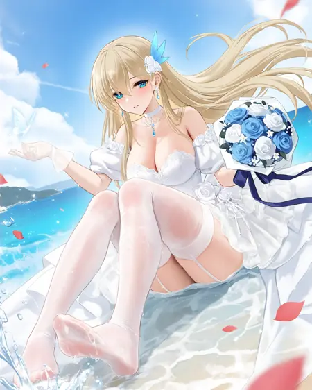 非强制性触发词white ribbon, 1girl, rock, blonde hair, cleavage, water, solo, holding bouquet, full body, looking at viewer, bare shoulders, feet, legs, blue sky, cloud, outdoors, wind, waves, floating hair, toes, splashing, wedding dress, white dress, strapless dress, large breasts, blue eyes, day, puffy short sleeves, puffy detached sleeves, official alternate costume, blue feather hair ornament, feather hair ornament, blue feathers, white choker, white gloves, butterfly on hand, falling petals, white elastic band, white garter straps, sitting, sitting on rock, necklace, earrings, blue gemstone, wet clothes, see-through, white thighhighs, frilled dress, white rose, blue rose, toenails, very long hair, ocean, see-through thighhighs, wet thighhighs, no shoes, lace trim, lace dress, layered dress, lace bow, back bow, lace hairband, white bow, transparent butterfly, white butterfly, butterfly on bouquet, hair flower, white hair flower, daisy, satin dress, lace gloves, blue ribbon, character:lexington (cv-16) (warship girls r), tachi-e