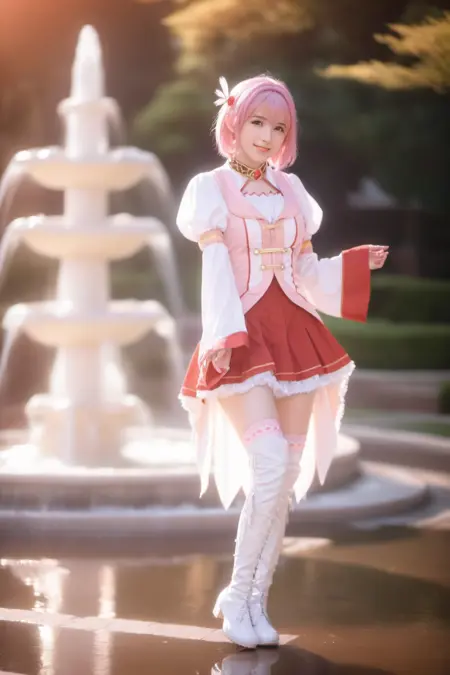 より詳細な原作衣装の指定を行うには、「short hair, pleated skirt, puffy sleeves, red skirt, thigh boots, thighhighs, white footwear, yui (princess_connect!)」を追加してください。