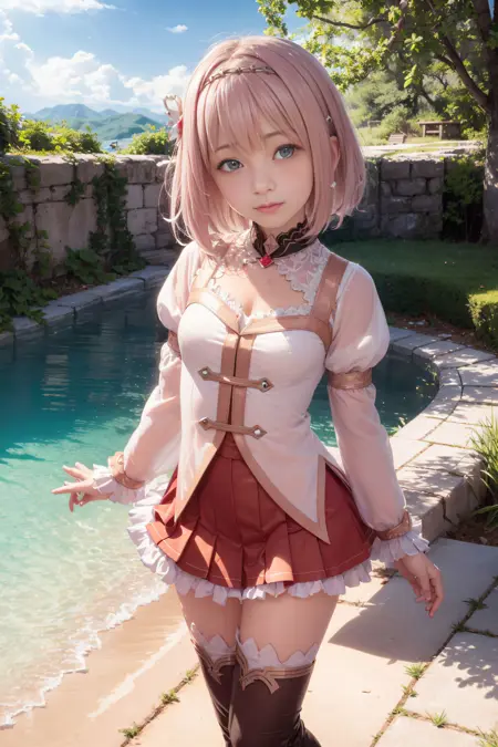 Add "short hair, pleated skirt, puffy sleeves, red skirt, thigh boots, thighhighs, white footwear, yui \(princess_connect!\)", for fully lock down details of the character with her origin outfit.