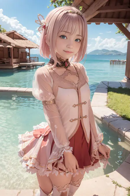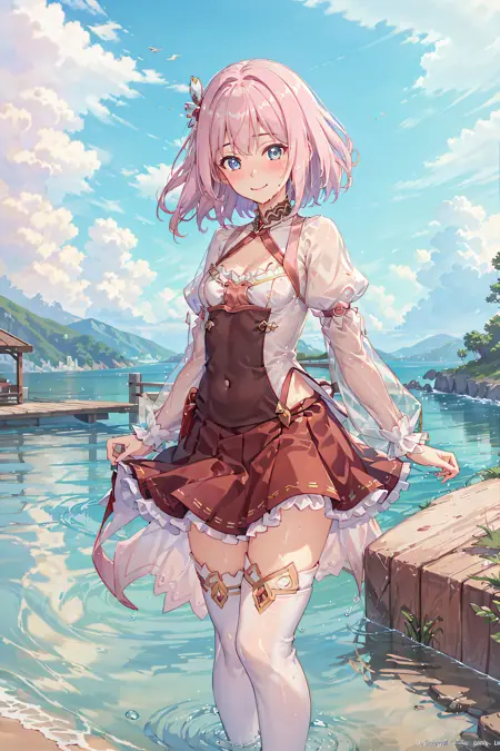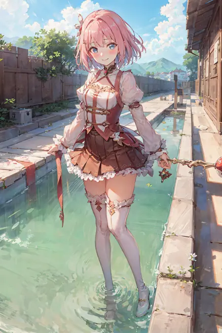전체적으로 원래 복장의 세부 사항을 완전히 고정시키려면 "short hair, pleated skirt, puffy sleeves, red skirt, thigh boots, thighhighs, white footwear, yui (princess_connect!)"를 추가하세요.