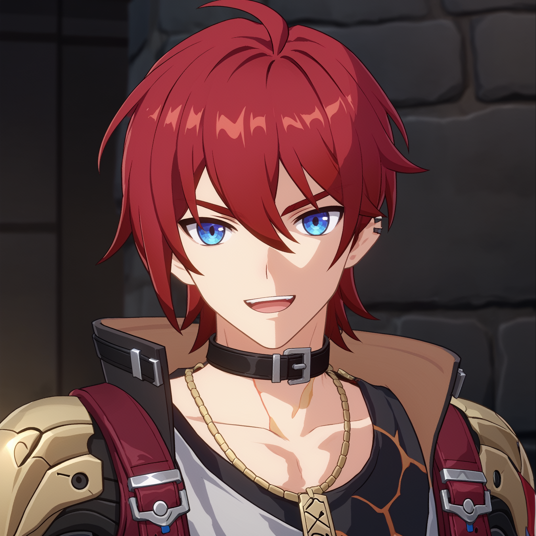 luka, red hair, ponytail, blue eyes, mechanical arm