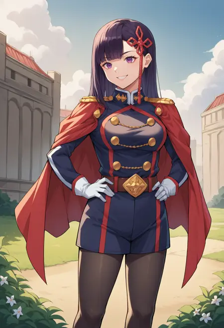 YamashiroRen, long hair, blunt bangs, hair ornament, military uniform, epaulettes, white gloves, red cape, belt, black pantyhose