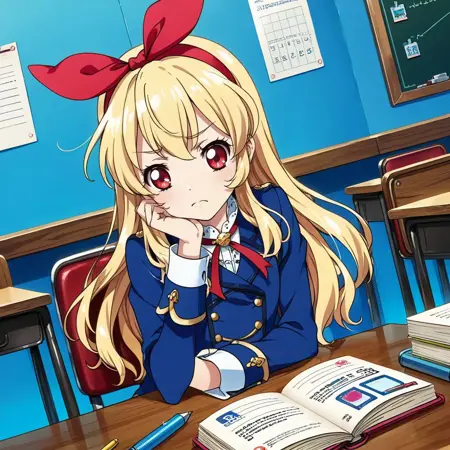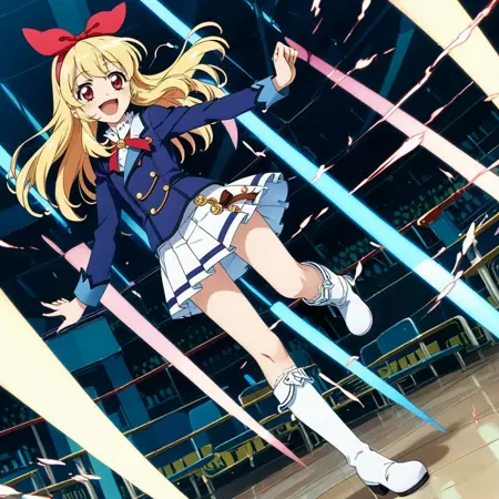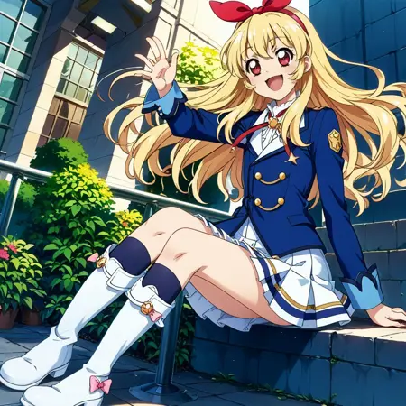 trigger: 星宫草莓,金发,长发,红眼,发带,蝴蝶结,发饰蝴蝶结,丝带,红色发带,星光学园校服,夹克,蓝色夹克,白色裙子,白色鞋履,及膝靴