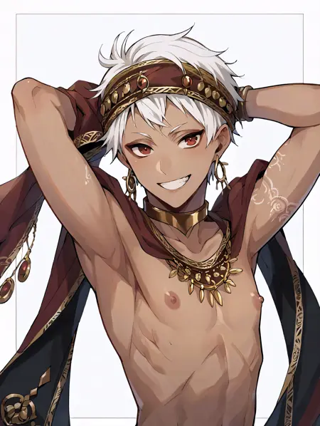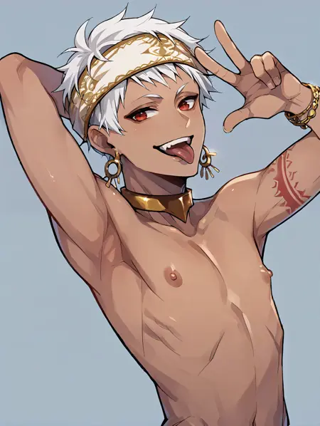 推荐提示词: kalimalasim, 1boy, slim, dark skin, arm tattoo, red eyes, white hair, headband, short hair, jewelry, earrings, scarf, lora:KalimAlAsim\_PDXL:1