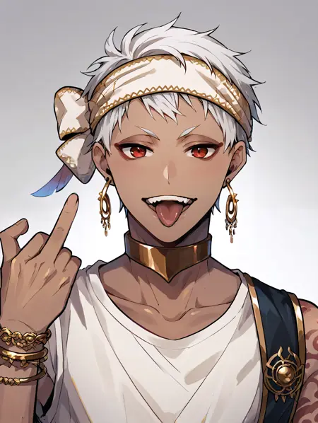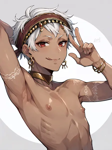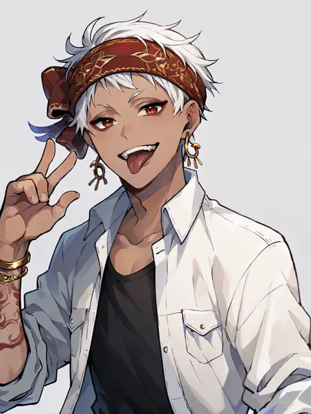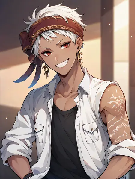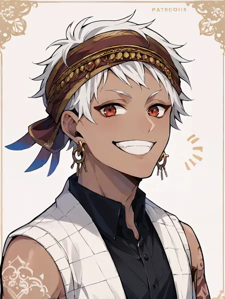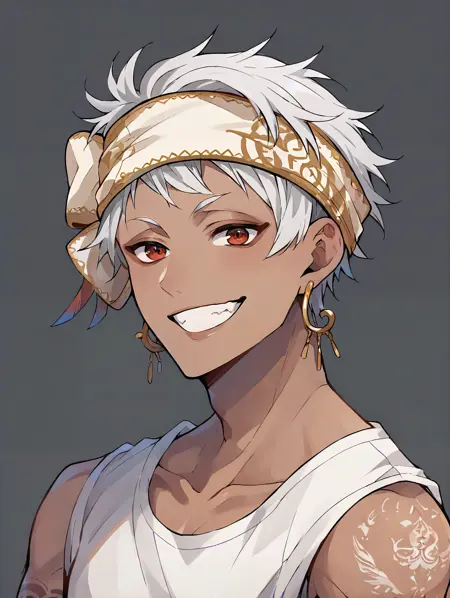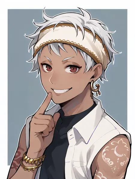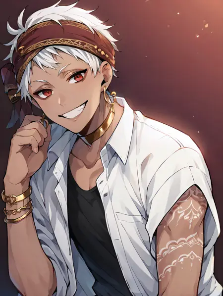 Recomended prompt: kalimalasim, 1boy, slim, dark skin, arm tattoo, red eyes, white hair, headband, short hair, jewelry, earrings, scarf, lora:KalimAlAsim\_PDXL:1
