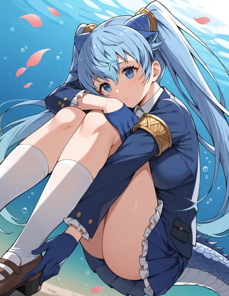 トリガー語:seiryuu \(kemono friends\), 1girl, animal ears, blue eyes, twintails, long hair, very long hair, blue hair, dragon tail