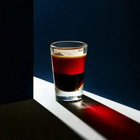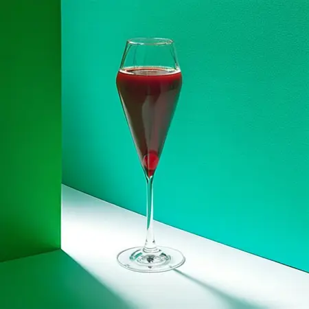카ок테일, 쿠페 유리잔, 연한 노란 투명한 액체 색상, 얼음 없음, 레몬 껍질 비틀어 장식, 유리잔 림에 장식, 왼쪽 녹색 배경, 오른쪽 빨간 배경, 흰색 바닥