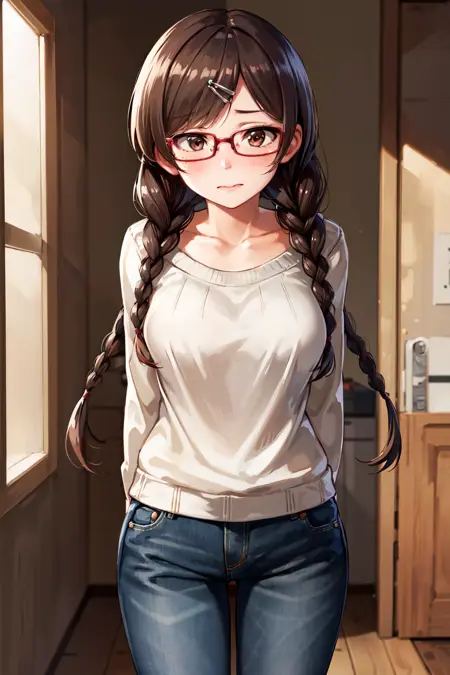 outfit3aachizuru, 긴 머리, 쌍="<?= mysterious; me, glasses, collarbone, black shirt, long sleeves, pants, jeans