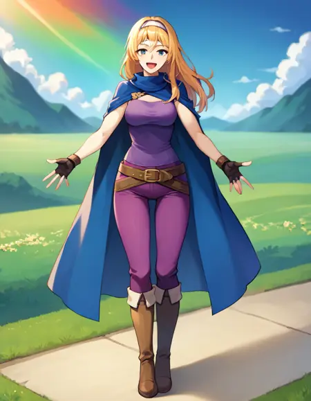 《火焰纹章:光辉黎明》中的海瑟。提示词为 "HeatherFE",她的服装为“无袖上衣、蓝色斗篷、裤子、靴子、头带”