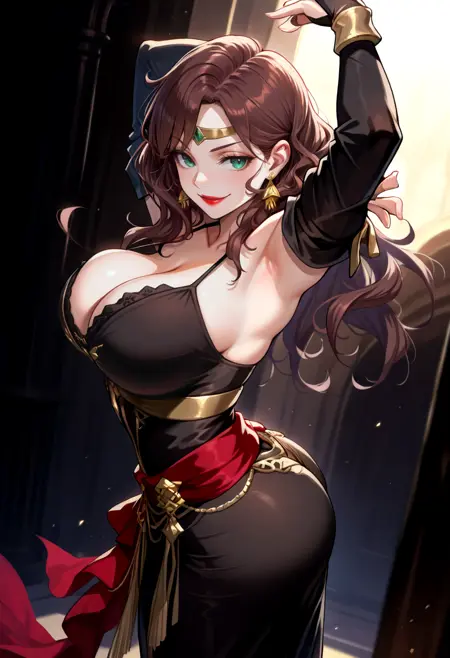 Garreg Mach Uniform: mldortgm, black headwear, black skirt, black uniform, brown hair, dangle earrings, gold trim, green eyes, jewelry, large breasts, long hair,