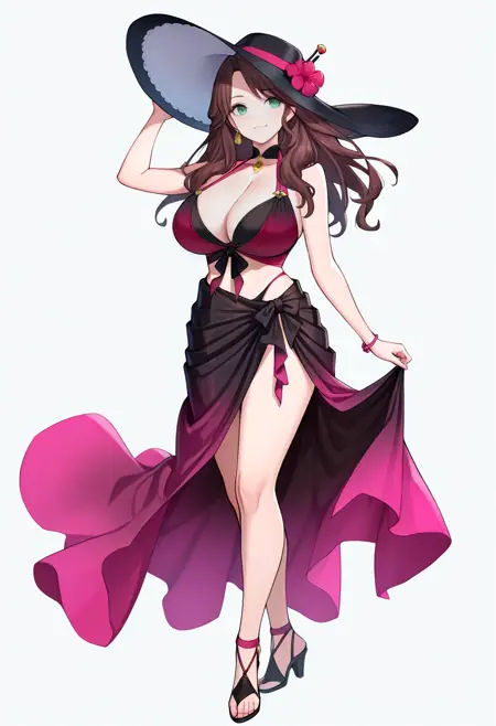Summer: black bikini, brown hair, green eyes, high heel sandals, jewelry, long hair, sarong, sun hat, gradient clothing, pink straps, bare shoulders, sleeveless, hair sticks, black hat, pink halter
