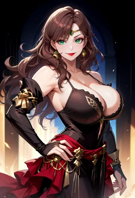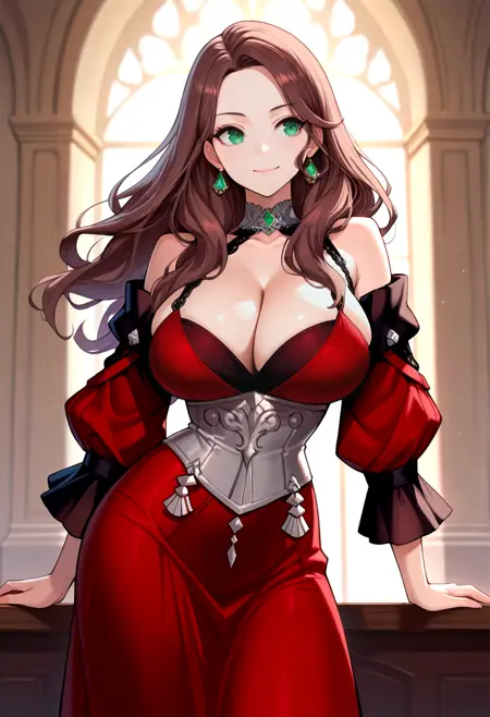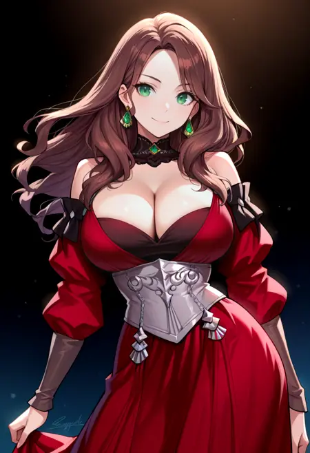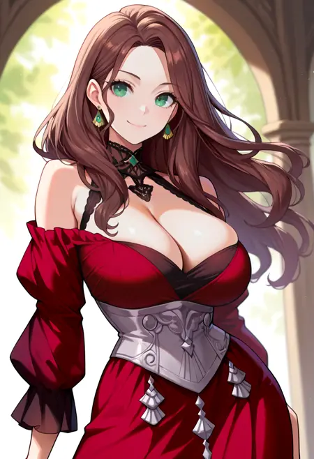 Post Timeskip: mldorts, brown hair, corset, green eyes, large breasts, long hair, long sleeves, red dress, silver trim, bare shoulders, cleavage, dangle earrings