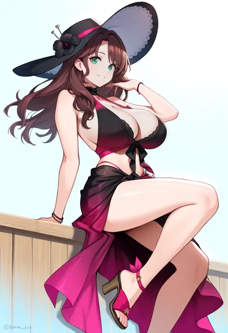 Overseas Memories (Bikini): mldorbk, black bikini, brown hair, green eyes, high heel sandals, jewelry, large breasts, long hair, sarong, sun hat, gradient clothing, pink straps, bare shoulders, sleeveless, hair sticks, black hat,