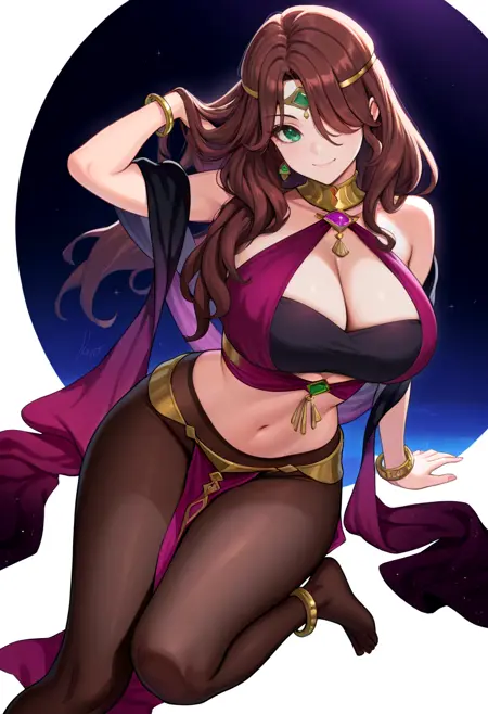 Plegian: brown hair, anklet, bandeau, barefoot, bracelet, circlet, green eyes, jewelry, long hair, midriff, pantyhose, shawl, gradient shawl, purple halter top, black bandeau, purple pelvic curtain, hair over one eye,