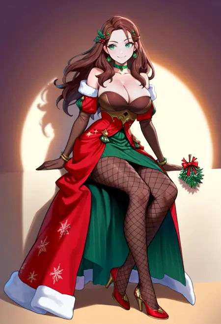 Winter: bare shoulders, bracelet, brown hair, cleavage, collarbone, detached sleeves, earrings, brown elbow gloves, brown bustier, green choker, green eyes, hair ornament, high heels, jewelry, large breasts, long hair, mistletoe, red dress, red showgirl skirt, green skirt, white fur trim, fishnet pantyhose,